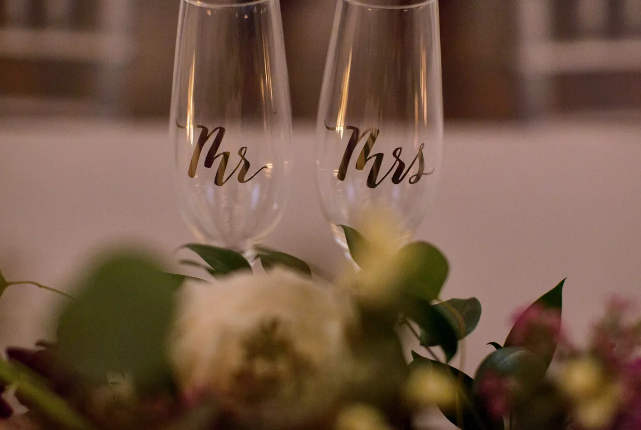Mr. and Mrs. Champagne flutes by sweetheart table decor